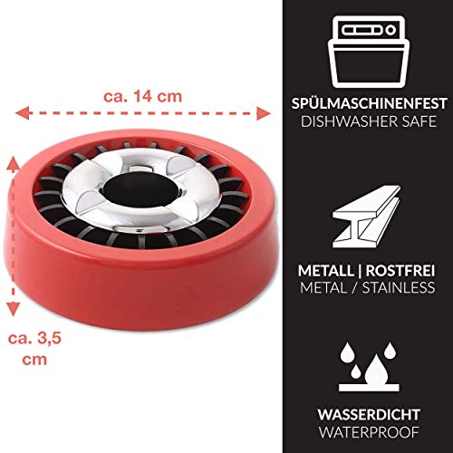 Inhoud levering: 3 rode metalen flessenkokers, asbak met afneembare smeltdoder, eenvoudige reiniging in de vaatwasser, roestvrij voor binnen en buiten, diameter: ca. 14 cm. Hoogte: ca. 3,5 cm.