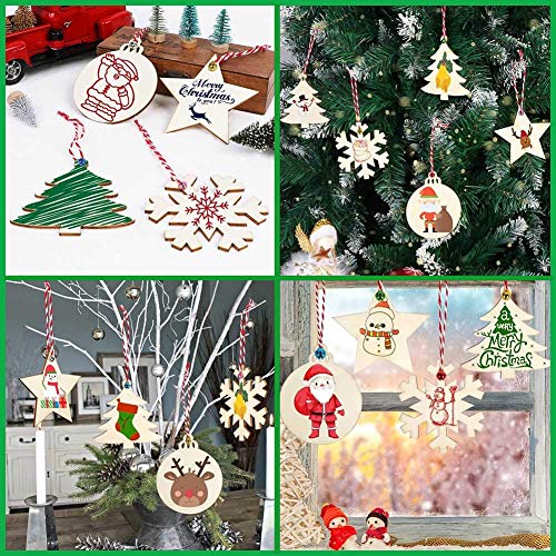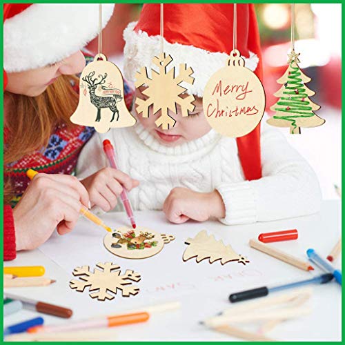 Specification: WIWJ 30 stuks kersthangers en 30 stuks belletjes, DIY kerstdecoratie hangers houten schijven sneeuwvlok ronde houten schijven houten kerstboom Kerstmis decoratie om te beschilderen en te versieren
