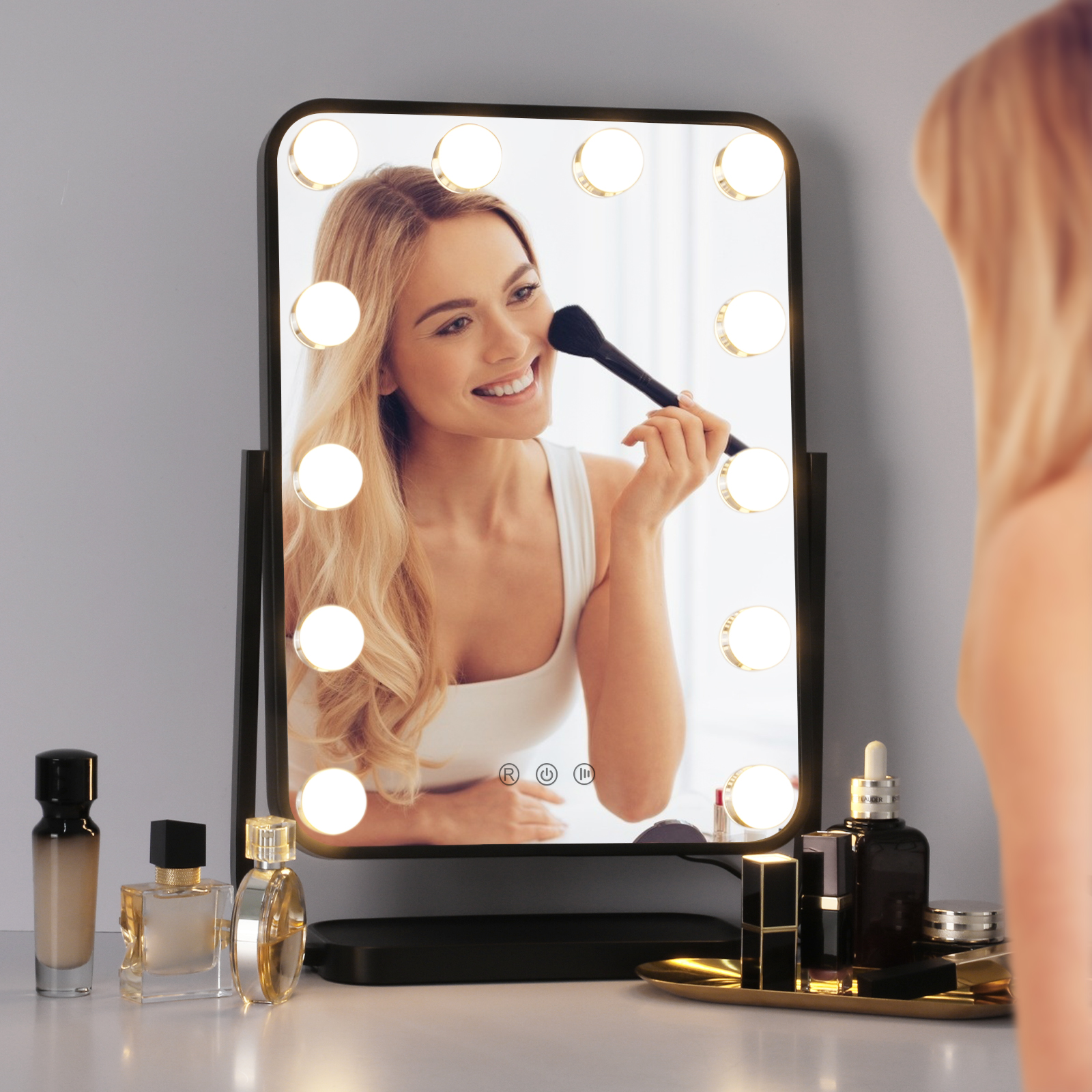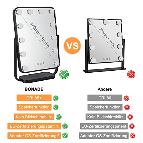 Specification: BONADE Hollywood Led-make-upspiegel met verlichting en touch-schakelaar, geheugenfunctie, 3 verlichtingsmodi, 12 dimbare gloeilampen, 360 graden draaibaar, zwart