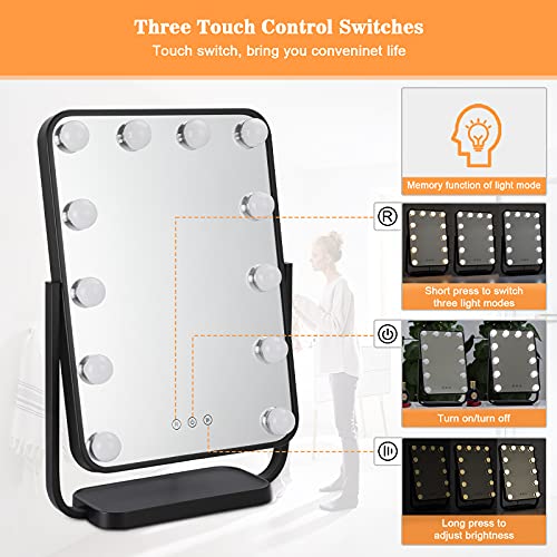BONADE Hollywood Led-make-upspiegel met verlichting en touch-schakelaar, geheugenfunctie, 3 verlichtingsmodi, 12 dimbare gloeilampen, 360 graden draaibaar, zwart
